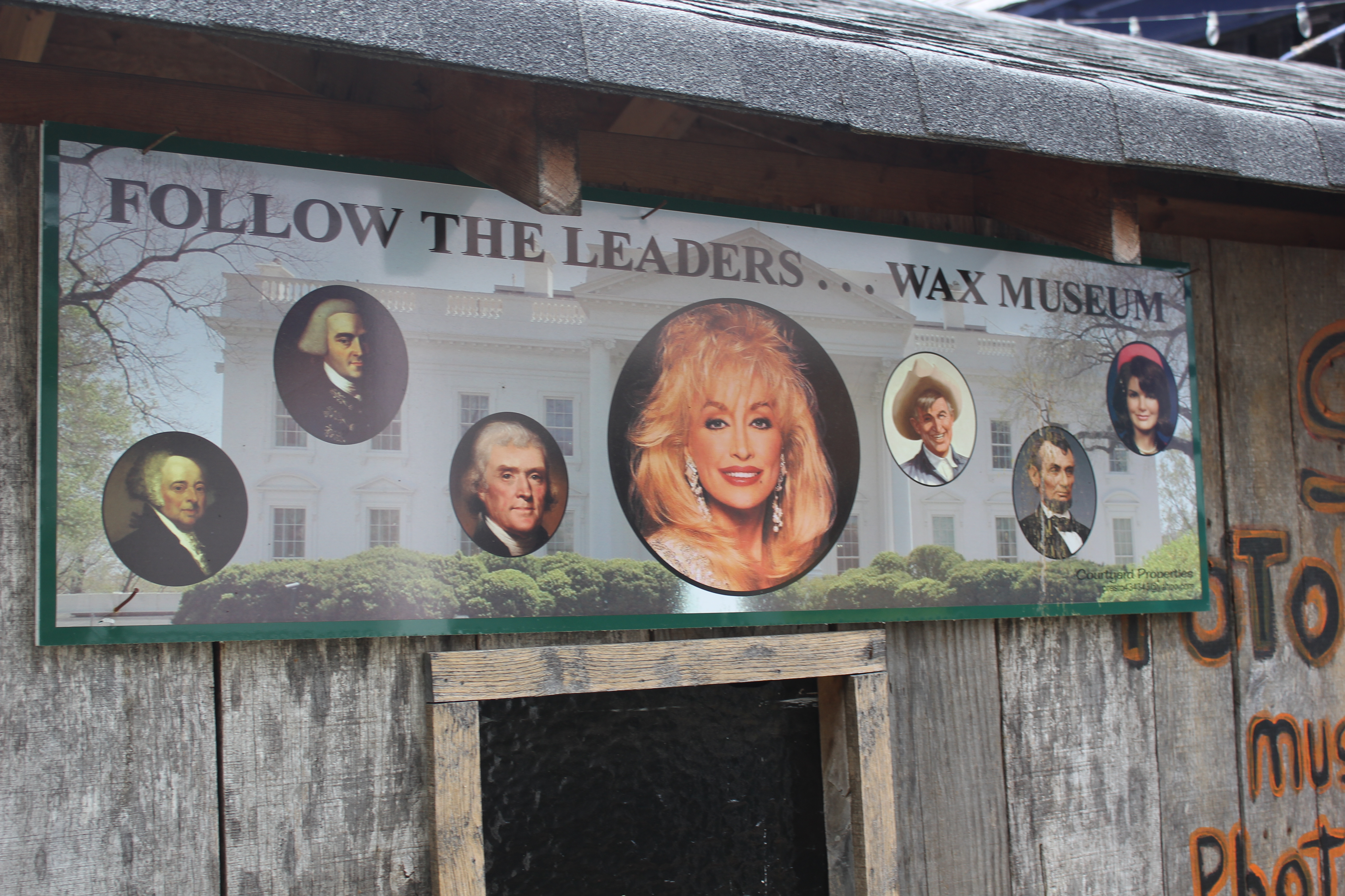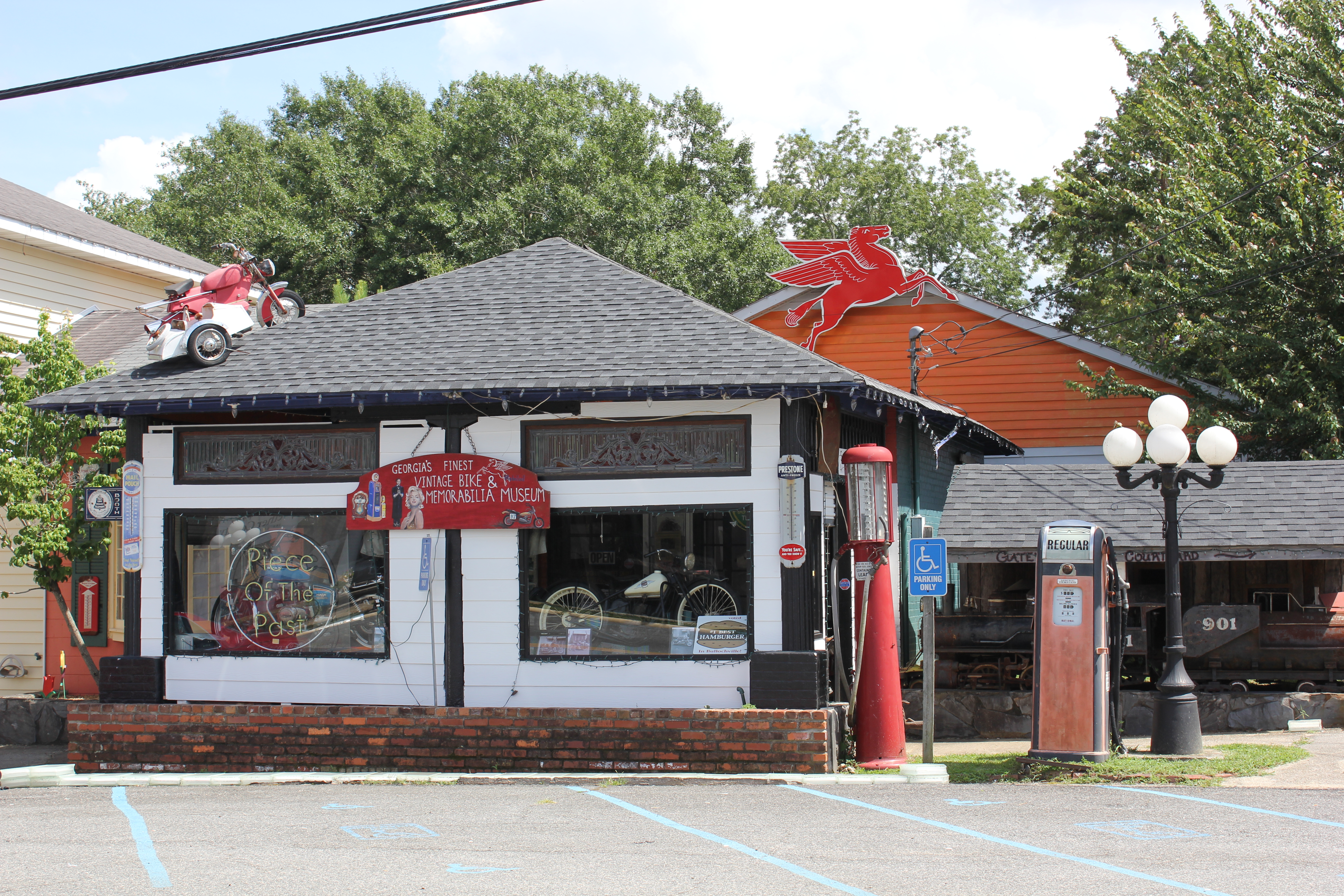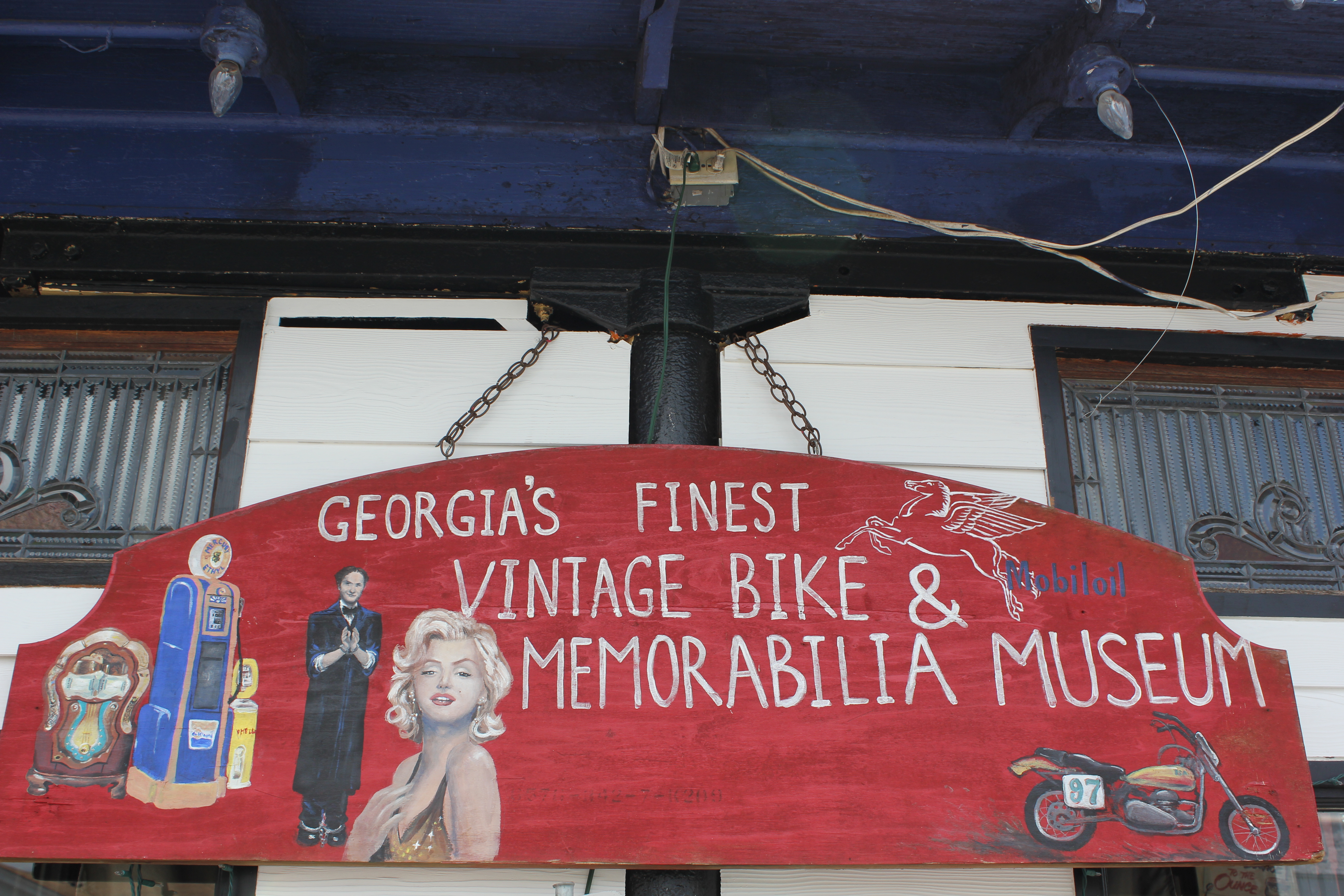 All of this is well and good, but the real highlight of the day started during lunch. Across the street from the Paradise Café is small white house with black trim, with a hand painted sign on front. The sign reads “Georgia’s Finest Vintage Bike & Memorabilia Museum.” As you first approach the house, certain things strike you as odd. The hand lettered sign that notifies you that the museum now has 25 50(!) vintage motorcycles, shoes for toddlers for sale, and a poster for a neighboring wax museum that proclaims “Follow The Leaders” and has pictures of the White House, several of our presidents, and Dolly Parton are among them.